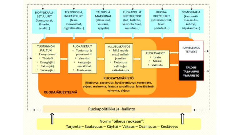 Ruokapolitiikka ja sitä toteuttava hallinto koskee koko järjestelmää, ja sen ajureita. Ne koskevat luonnonvaroja ja ympäristöä, tuotantoekosysteemejä, energiajärjestelmiä, markkinoita sekä mahdollistavaa talousjärjestelmää. Ruokapolitiikka ja -hallinto koskevat elintarvikeketjua maataloudesta kauppaan ja kulutukseen sekä kierrätykseen, ne myös ohjaavat kuluttajien valintoja ja arvoja sekä ruokavalioita. Ruokapolitiikan tulee luoda edellytykset tavoitellun kaltaiselle kansanravitsemukselle ja -terveydelle.