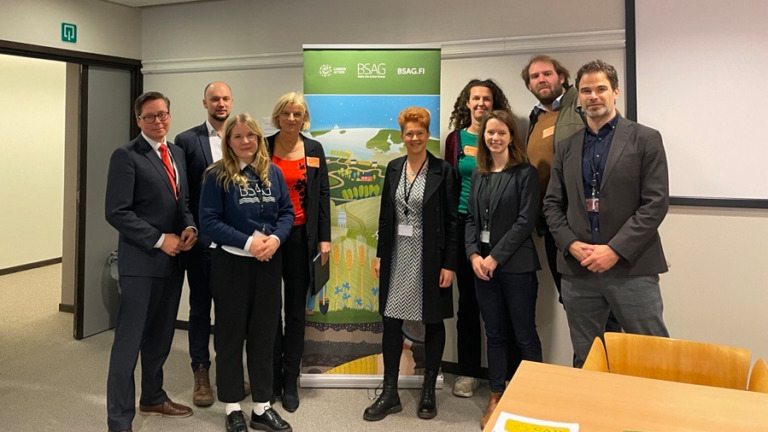 Speakers and BSAG staff at the Europen Parliament 11.12.2024. From left: Ville Wahlberg (BSAG), Rūdolfs Pulkstenis (CEJA), Emma Wickman (BSAG), Sjoukje Heimowaara (WUR), Kirsi Brück (BSAG), Klarien Klingen (Via Campesina), Celia Nyssens-James (EEB), Gerard Dumont de Chassart, Kaj Granholm (BSAG)