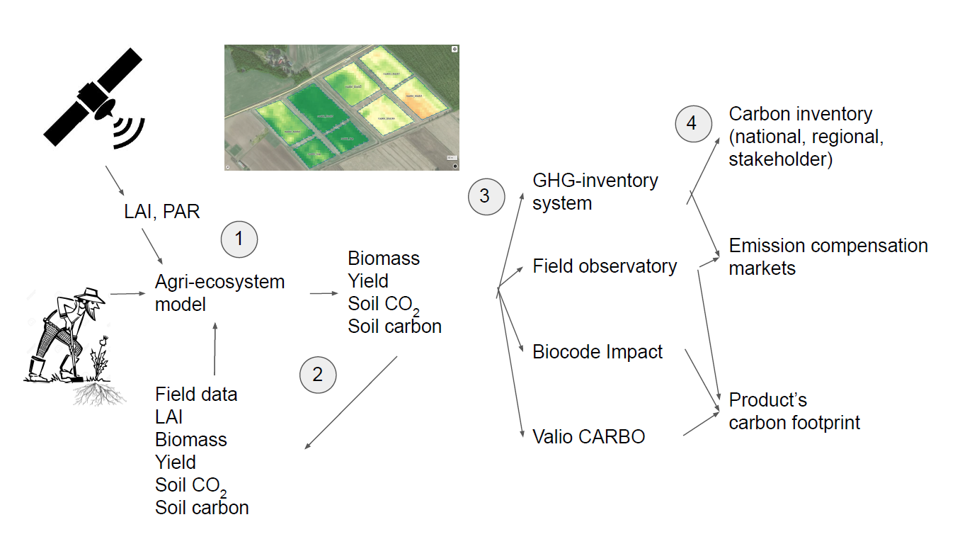 The BIOHILA project will develop a method for producing accurate information on field biomass by combining satellite- and field measurements and ecosystem modeling (1 and 2), and further to develop ways to utilize this information and method in agricultural carbon balance accounting (3 and 4). The numbers refer to the project work packages; fifth work package is responsible for communication and interaction. Figure: Jari Liski