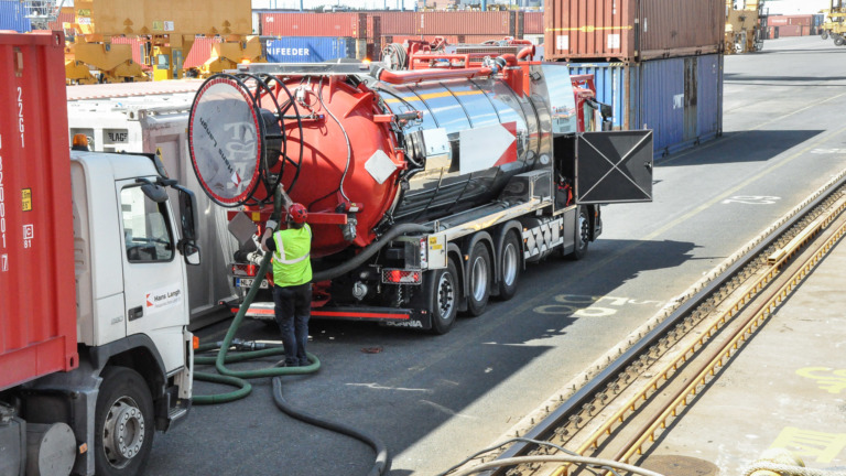 Jätevesiä puretaan säiliöautoon Vuosaaren satamassa.