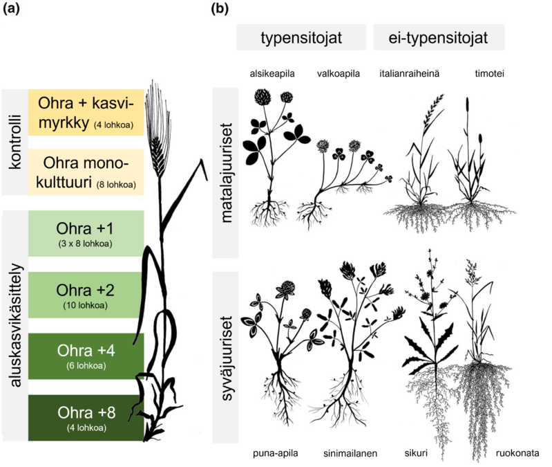 Kokeessa tutkittiin kahdeksaa kasvilajia, joista neljä oli typensitojia ja neljä syväjuurisia, siten että nämä ominaisuudet esiintyivät yhdessä ja erikseen (kuva 1b). Aluskasveja istutettiin ohran kanssa yksi tai useampia, sekä ohraa ilman aluskasveja kasvimyrkkyä käyttäen ja ilman (Kuva 1a). Kutakin erilaista koeasetelmaa oli vähintään kolmella lohkolla (ks. kuva 1a) ja yhteensä kokeessa oli 56 lohkoa. Ohra kylvettiin touko-kesäkuussa ja kylvölannoituksena annettiin typpeä 80 kilogrammaa hehtaaria kohden. Aluskasvit kylvettiin viikkoa myöhemmin. Lehtitaudin esiintyminen tutkittiin määrittämällä lehden vaurioitumisaste, eli lehdissä näkyvien laikkujen määrä. Koealat sijaitsivat Viikissä, Helsingissä, ja tämän tutkimusartikkelin kokeet toteutettiin vuonna 2020.