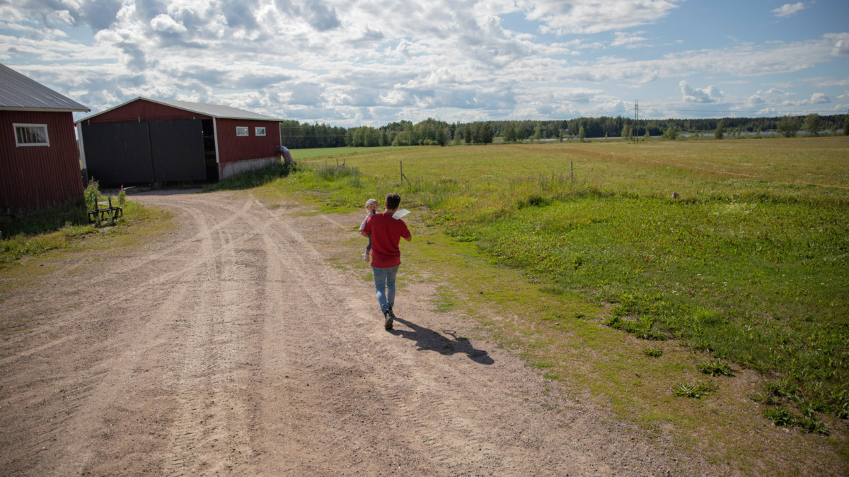 Istahdamme Hasun keittiönpöydän ääreen. Hasu asuu kahden lapsensa kanssa vaaleansinisessä puisessa omakotitalossa, jota kiertää silmänkantamattomiin peltoa. Pihalta voi tähystellä muutaman sadan metrin päässä laiduntavaa hereford- ja angus-rotuista karjaa. Niiden ympäri kulkee kilometrien pituinen sähkölanka-aita. Neljänsadan metrin päässä virtaa Kymijoki, vanha valtakunnan raja.