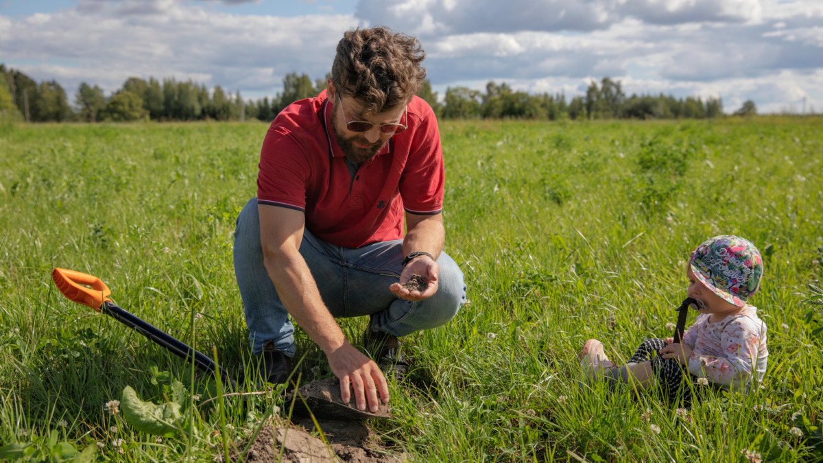 Heti ensimmäisestä kourallisesta löytyy kastemato. Sen hän ojentaa tyttärensä käteen tutkittavaksi.