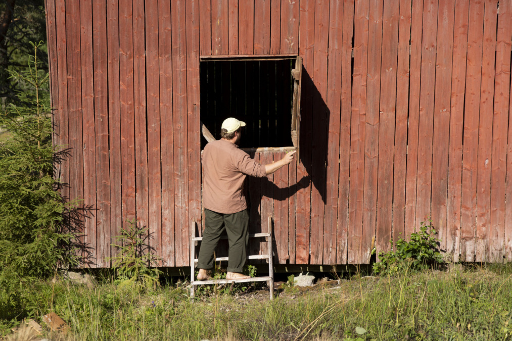 Menemme pihalle syömään herneitä. Kipuamme puisia tikkaita pitkin sisälle latoon, joka on tarjonnut tilallisen esikuvan Porin taideteokselle. Sisään mennessä täytyy ikään kuin kumartaa. Ladon sisuksista löytyy puuromua, vanhoja ruosteisia laitteita, lautakasoja. Katto on tehty ylimääräisistä jämäpaloista.