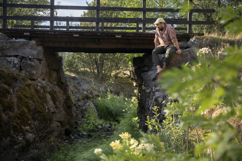 Kävelemme mökin pihalta kivenheiton päässä olevalle rotkon reunalle, josta näkyy virtaava oja.